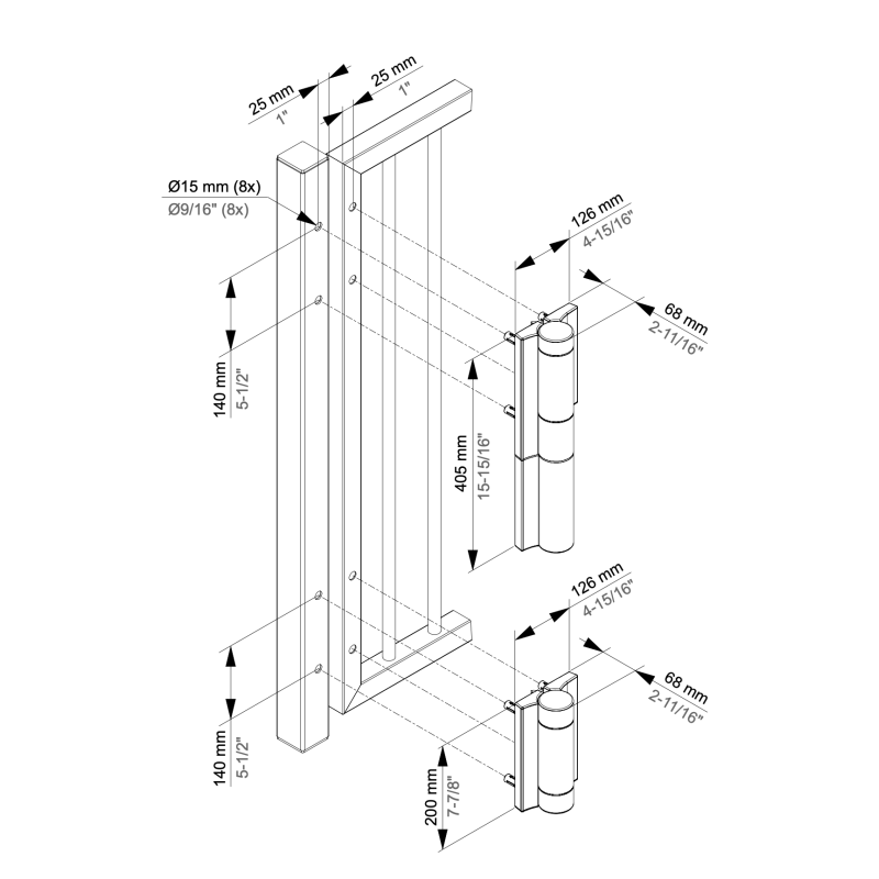 La charnière est adaptée aux poteaux à partir de 60 mm et aux profils de portail à partir de 40 mm.